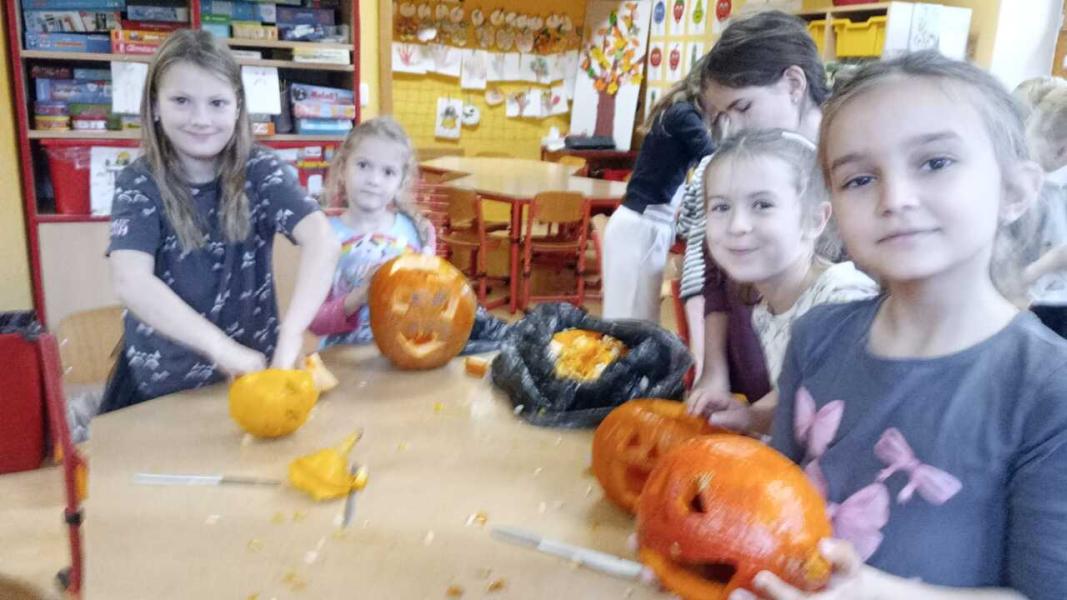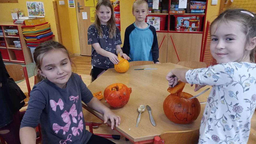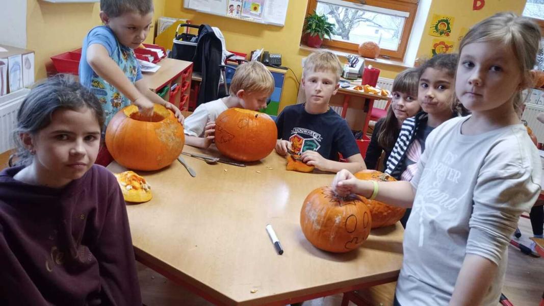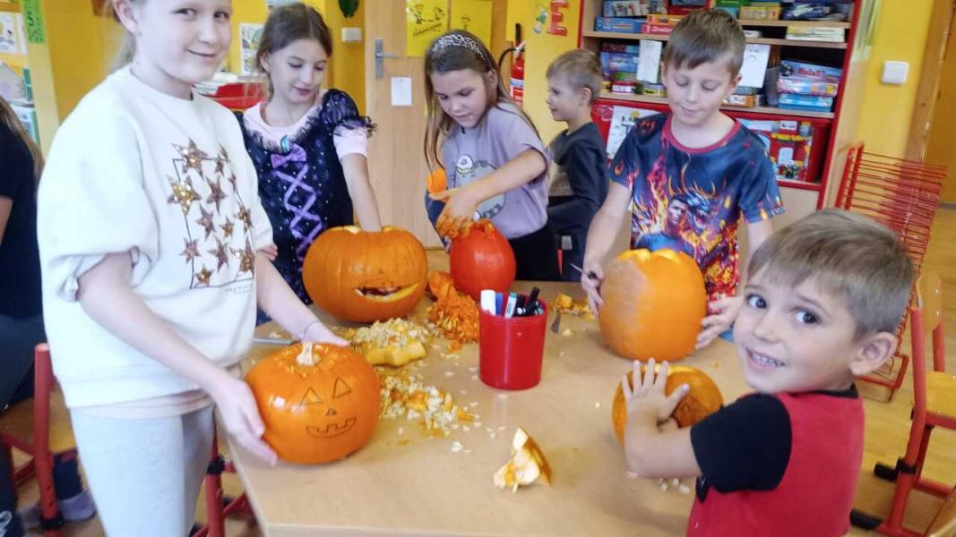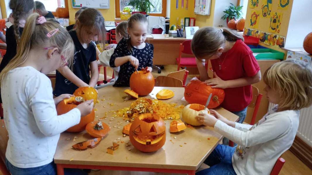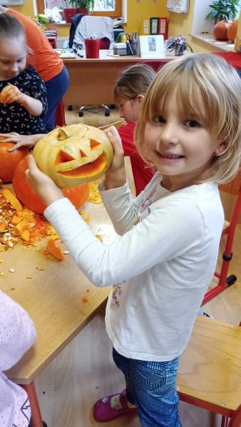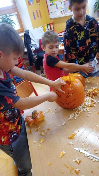 Odpoledne se moc vydařilo. Děti se potkaly ve skupinách. Dlabaly dýně, tvořily ozdoby a hrály hry v tělocvičně. Text a foto LP, TD.